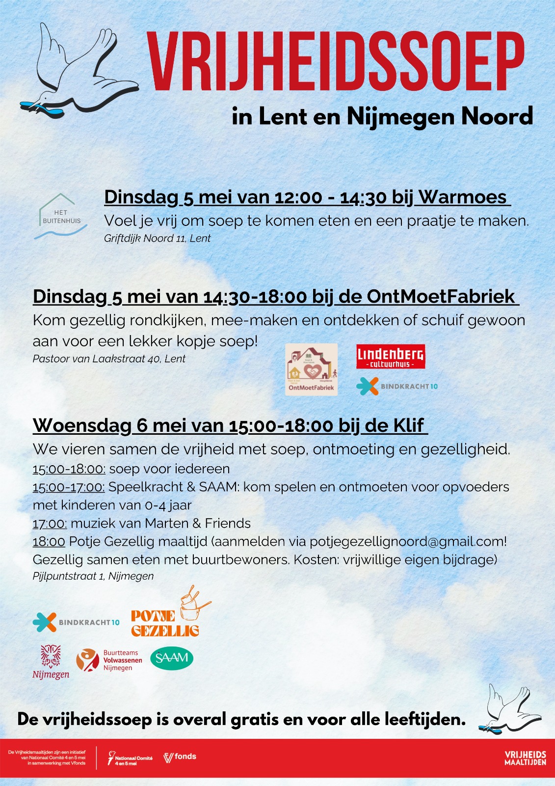 Op dinsdag 5 mei ben je van 12.00-14.30 uur welkom bij de Warmoes. Daar organiseren we vanuit het Buitenhuis een vrijheidsmaaltijd. Iedereen is welkom om aan te schuiven voor een lunch met een kop soep, brood en een praatje. De maaltijd is gratis en een mooie gelegenheid anderen uit de wijk te ontmoeten. Van jong tot oud, welkom!
